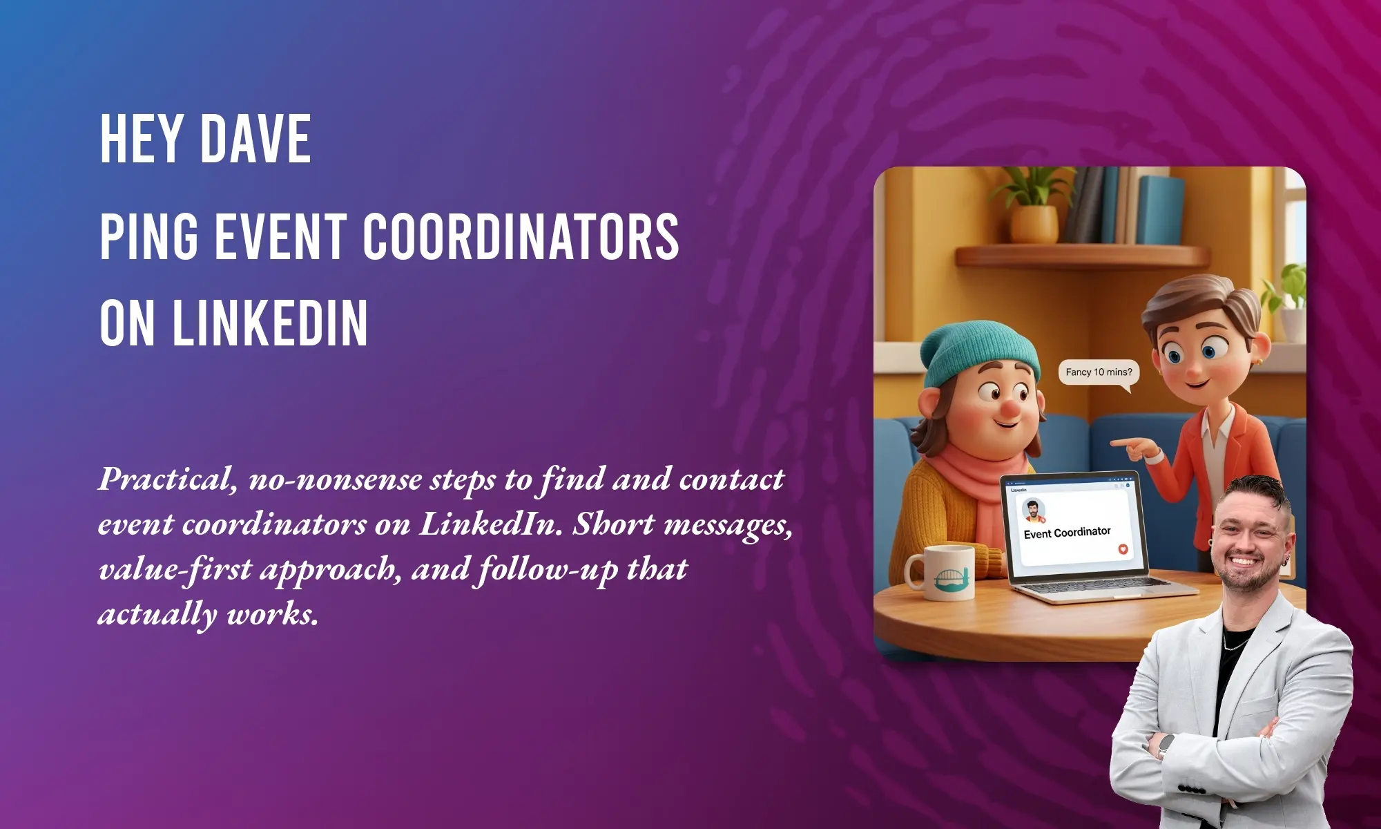 Short and useful. Example: “Hi Emma — I noticed you run events for [Company]. I help speakers/venues get more bookings and wondered if you’re open to a quick 10-minute chat? Cheers, Dave.” Keep it under 300 characters and personalise one line.